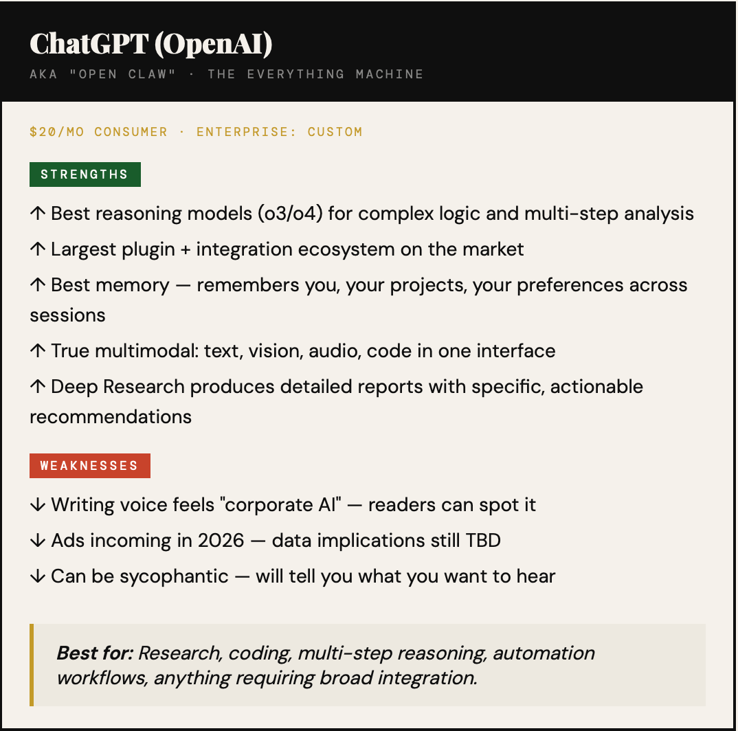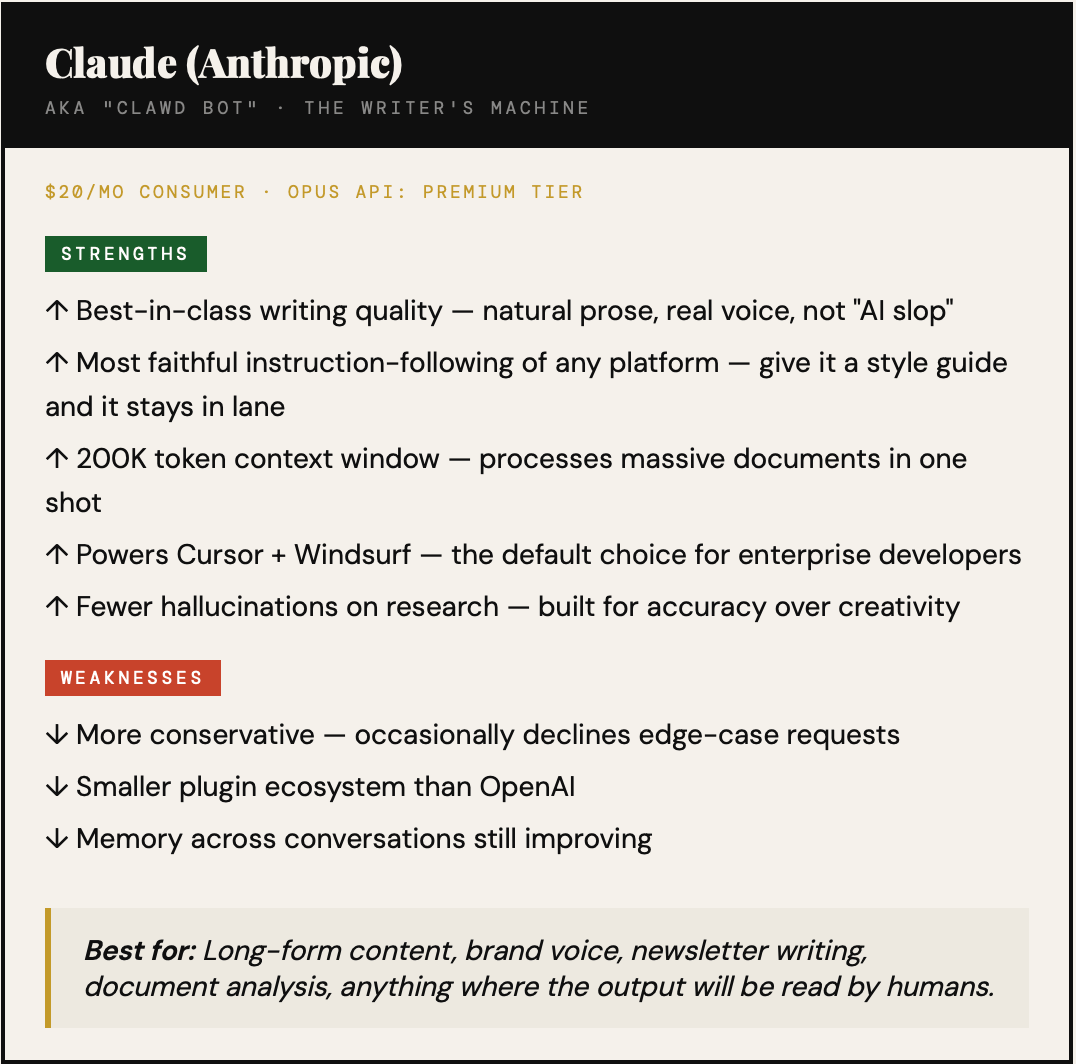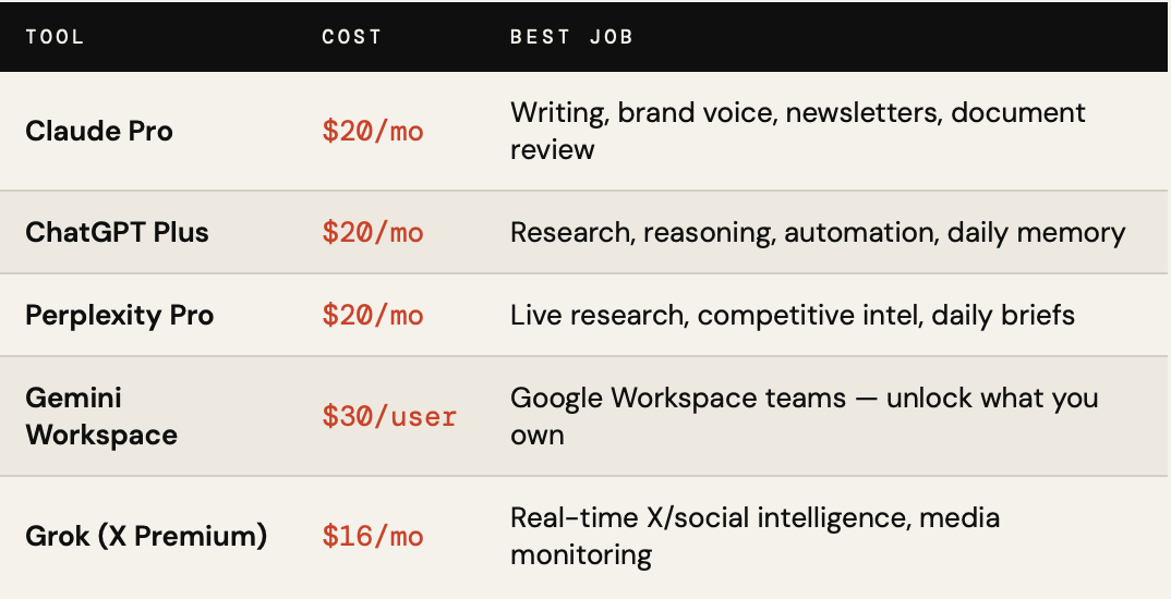 This issue is a no-spin breakdown of the major players, what they're actually good at, where they fall apart, and how a lean business should be thinking about spend. We'll also settle the Clawd bot vs. Open Claw debate because the answer is more interesting than most people expect.