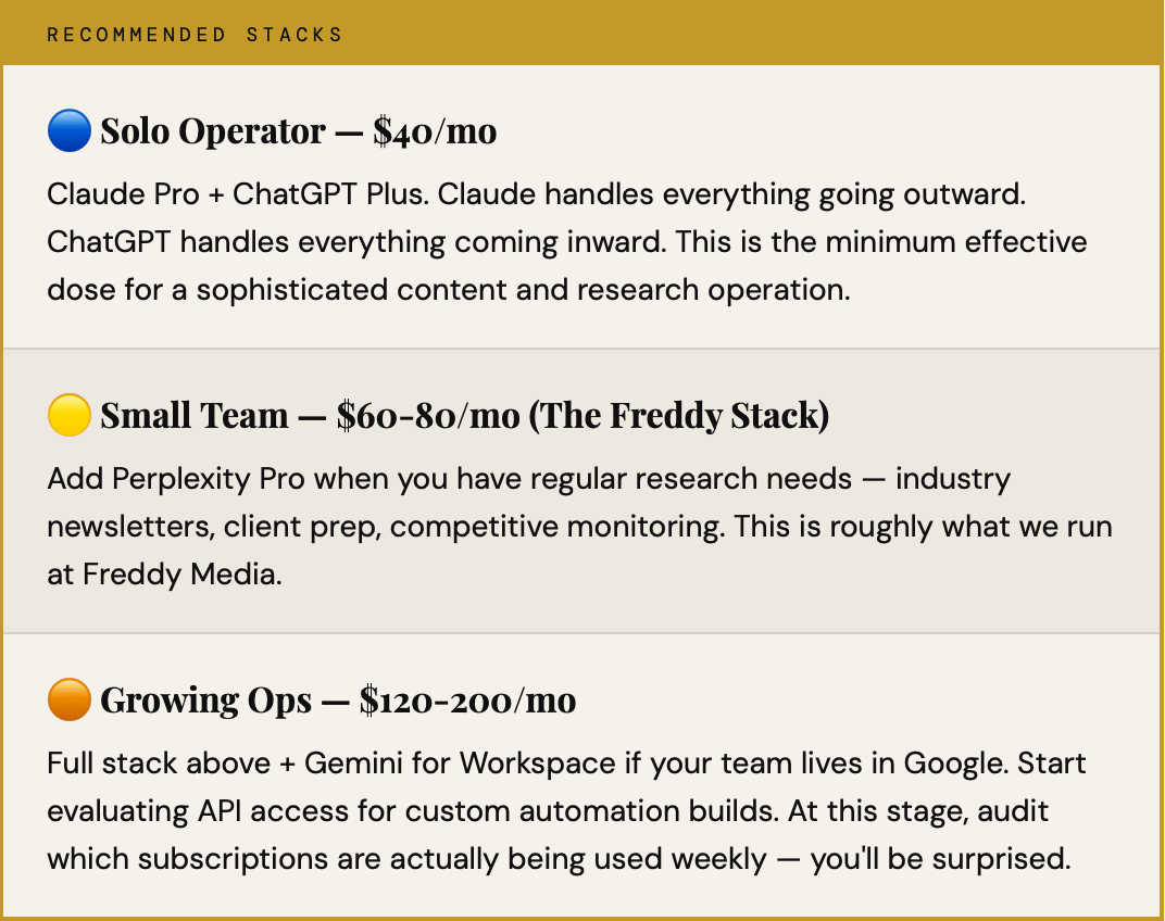 The average small business in 2026 is spending $100-200/month on overlapping AI subscriptions doing mostly the same thing. Two rules cut through this fast: