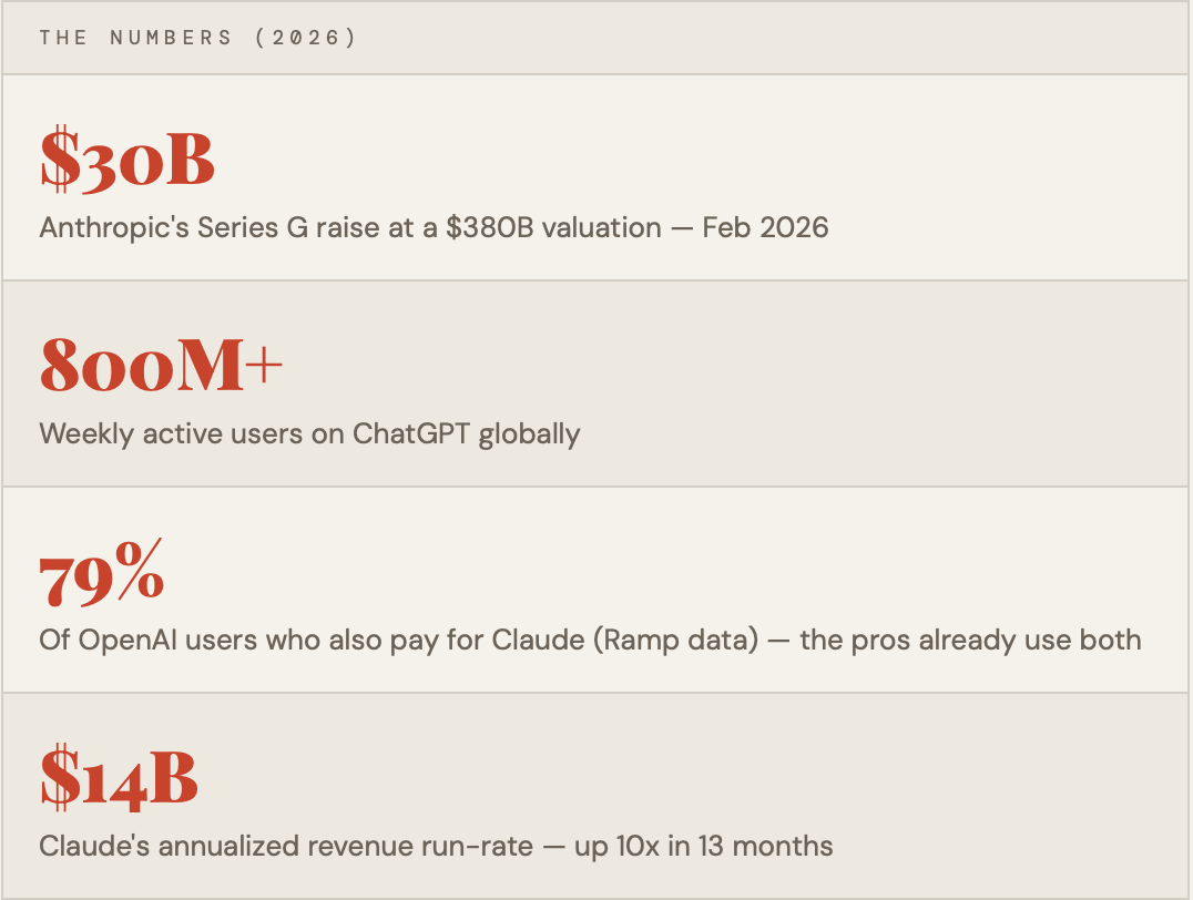 In Q1 2026, three things happened that most operators missed: Anthropic closed a $30 billion round at a $380B valuation. OpenAI hit a reported $19-20B ARR and announced ads are coming to ChatGPT Search. And Google's Gemini crossed 750 million monthly users while quietly dominating enterprise Google Workspace.