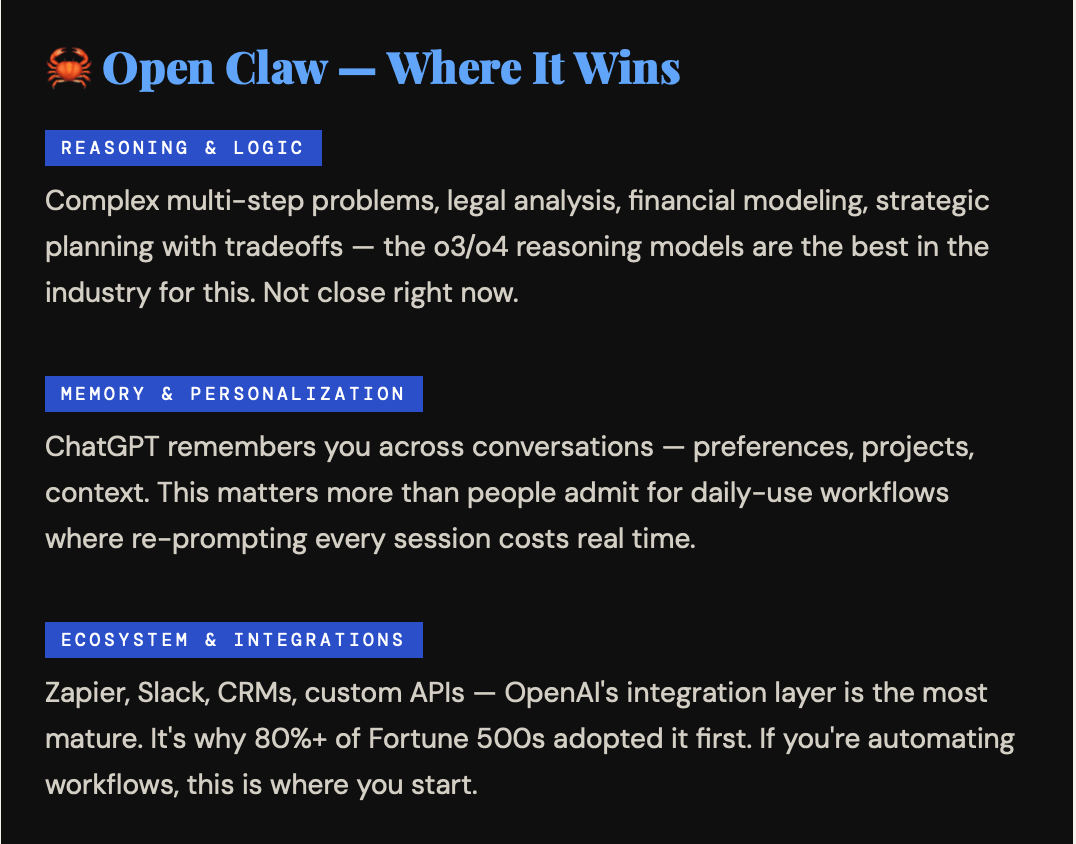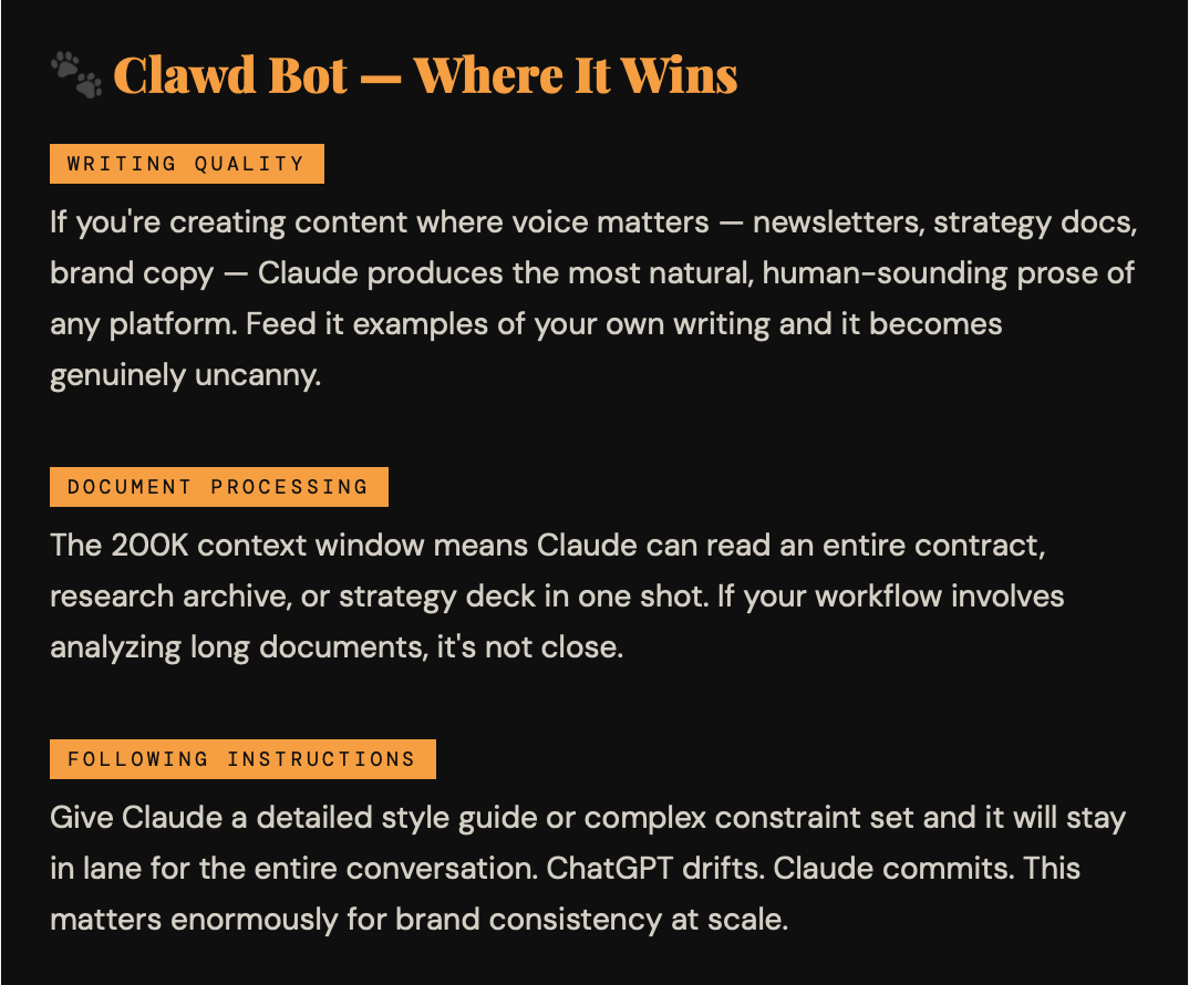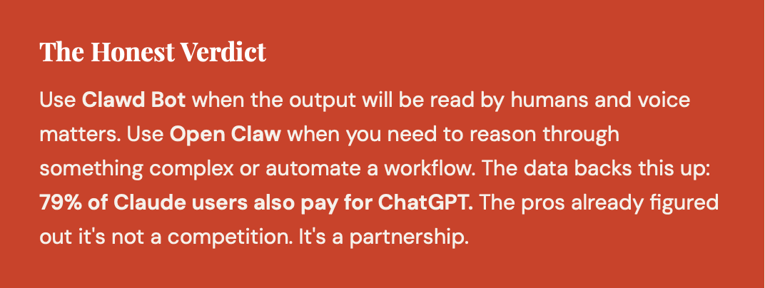 One more thing worth saying plainly: the Clawd bot vs. Open Claw debate is a consumer conversation. Operators don't pick sides. They pick jobs. The question is never "which AI is best", it's "which AI is best for this task, right now, given what I need to produce."
