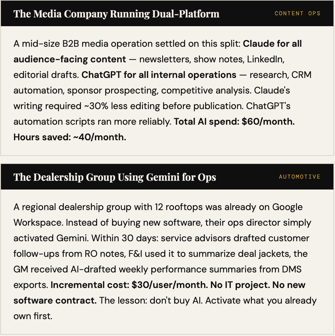 Let's get one thing out of the way: the AI platform conversation has gotten exhausting. Every founder you meet is either "all in on ChatGPT" or on some Claude evangelist kick, and meanwhile your ops person is secretly using Gemini because it's built into their Google Docs.